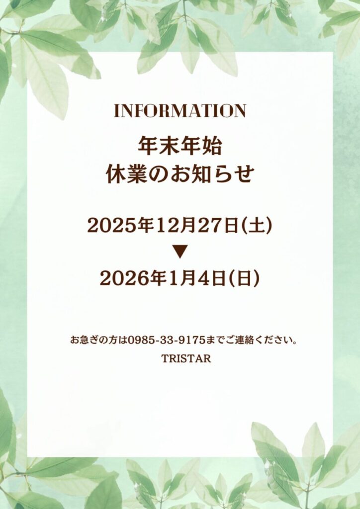 本年も大変お世話になりました。令和7年12/27まで営業し、令和8年12/27-令和8年1/4は、営業をお休みさせていただきます。
